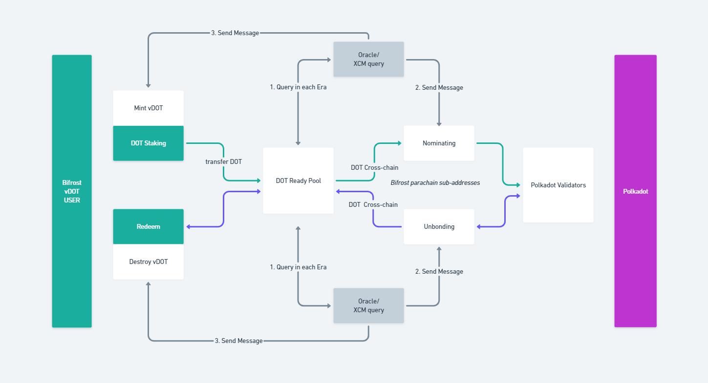 4. Parachain sub-addresses execute Staking to SLP Polkadot validators set, Oracle queries the successful messages and send them back to Bifrost DOT Ready Pool, get ready for the next matching.