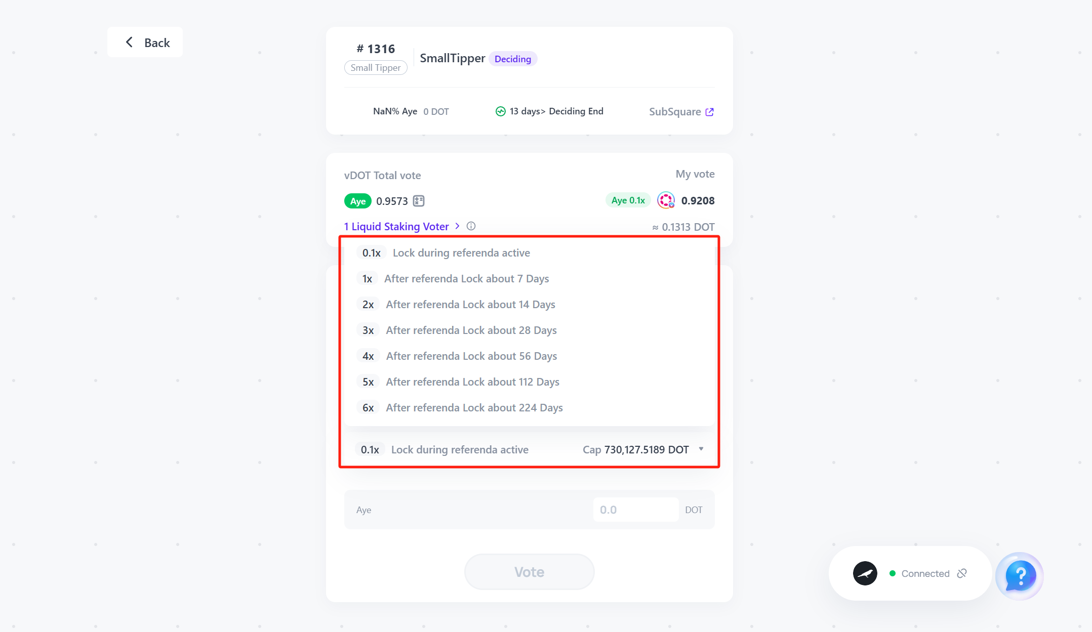 3. The amount of staked DOT in the derivative address represents the maximum voting power of that address (as shown in the figure below). The address will vote in favor of Referenda 1 with 12 DOT and lock 3x Conviction.