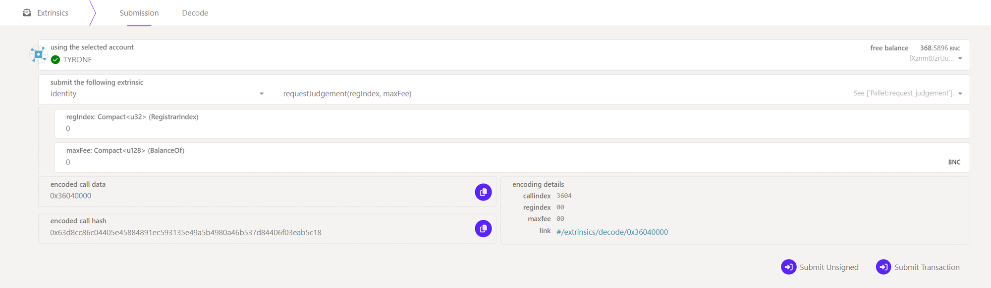To be judged after submitting your identity information, go to the [Extrinsics tab in the Polkadot-JS UI](https://polkadot.js.org/apps/#/extrinsics) (Make sure you choose the right network) and select the `identity` pallet, then `requestJudgement`.